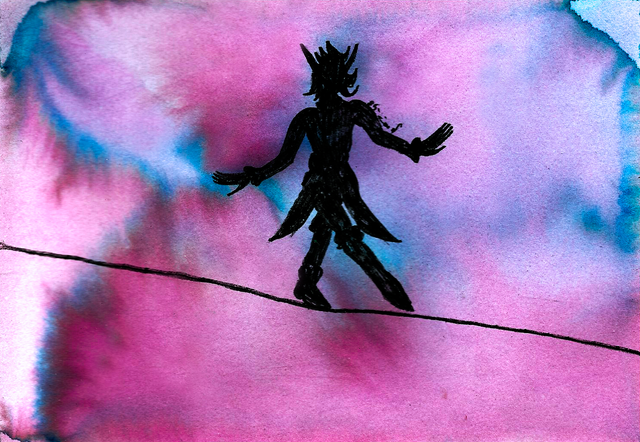 Funambulist.Life these days is full of dangers. And sometimes, we just have to take a risk and confront those dangers like a pregnant cow in heat. Our options in life are to be walking on the tight-rope of life- enduring the difficulties of it- or ending up on the ground like a flattened insect. Live your life.
