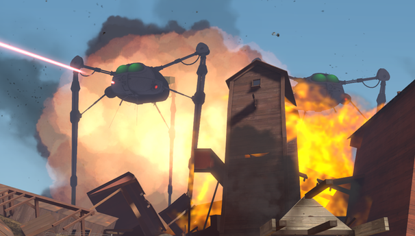 A pair of tripods search the landscape for any humans that may have survived their destructive onslaught.More art using my new fighting Machine design
