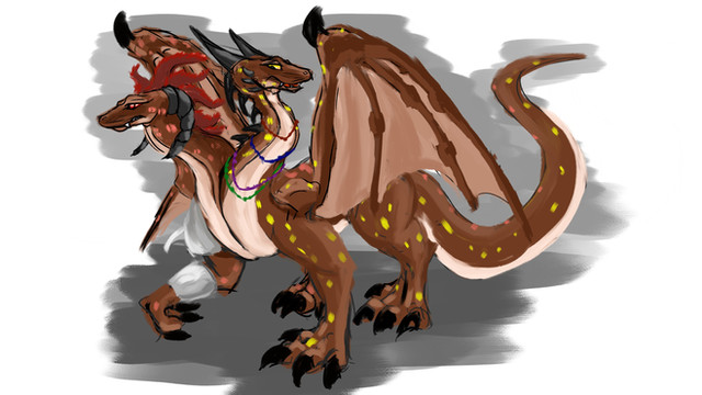 I pursued the goal of putting the ax into the paws of the two-headed hydra, maintaining the feral physique and not depriving the forelimbs of visual mobility. Many dragons in my book world are not deprived of motor skills, they grab and hold objects - almost like humans, but in this case I almost failed the task, focusing on posture and excessively long hind legs. Serves me right, I'll give it another try someday.Daviora (left), Menzinela (right)