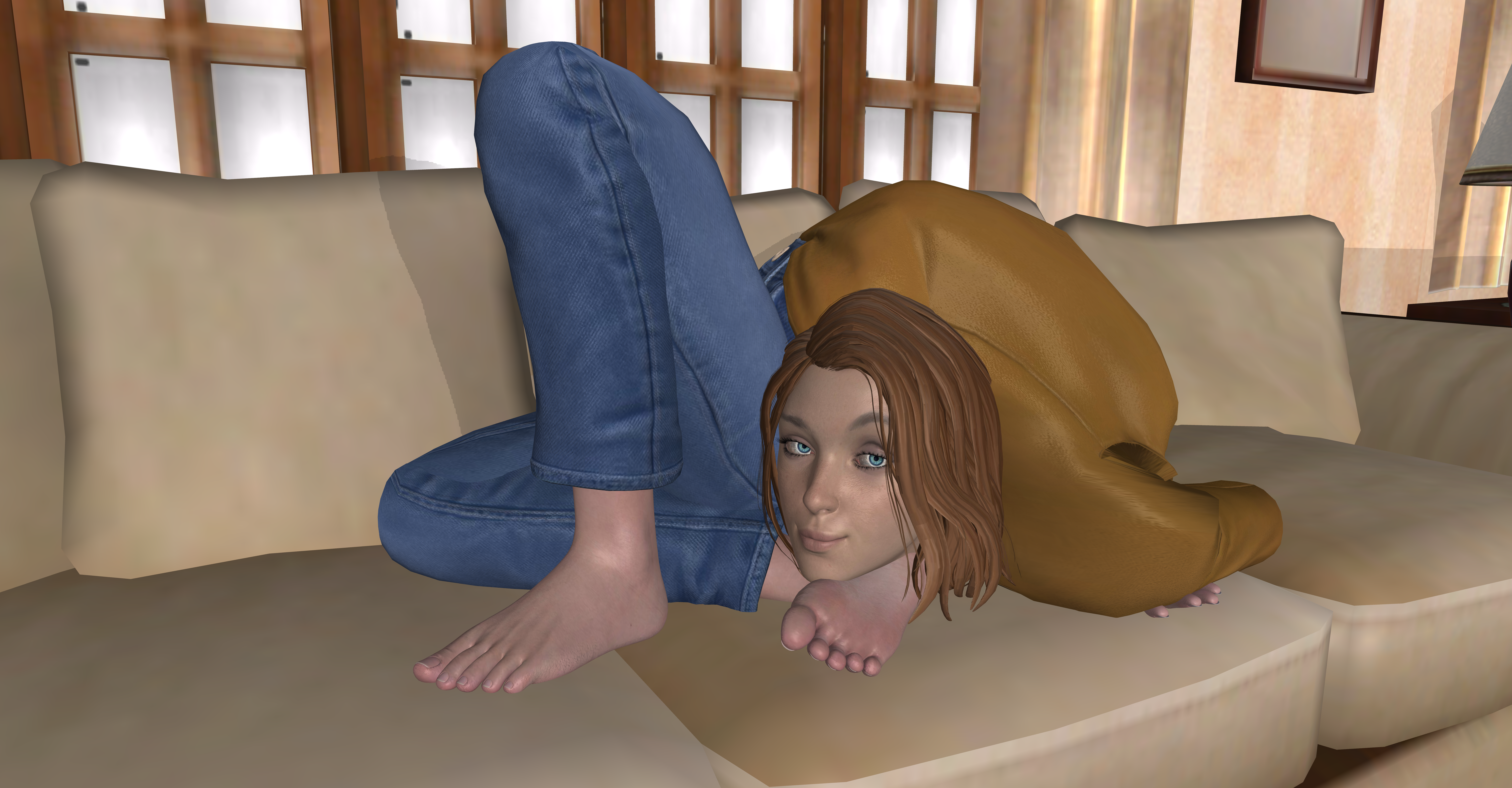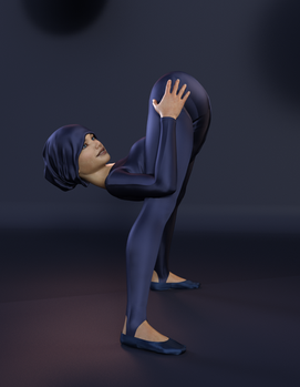 Here's a render of I-Am-Jubilee 's character "Book." She's got a real tendency to end up in less than convenient positions such as the one pictured, but thankfully she's got the "rubberyness" to come out just fine. I would think most of her irritation comes from the total lack of control hereBook is Jubilee's original creation so direct any questions about the character to her.