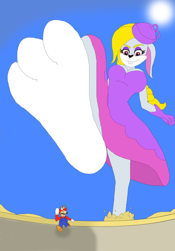 Thought I do this character again so here’s Harriet from 'Super Mario Odyssey' as a giantess as she’s about to stomp onto Mario & Cappy as they try to escape from an ever closer certain doom.