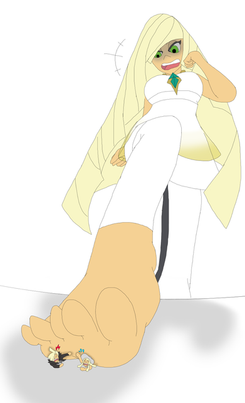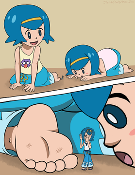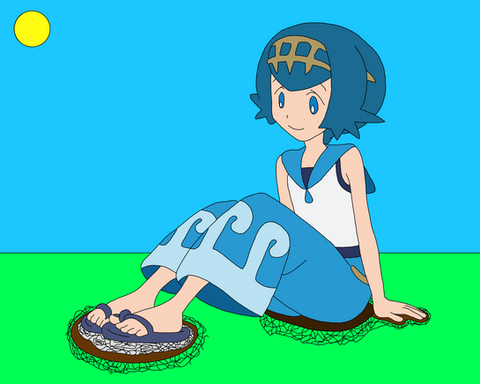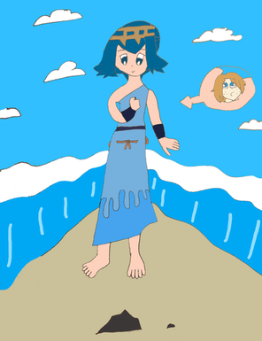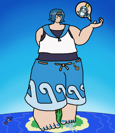 This is a Commission fromHe commissioned for Lana from the pokemon series as a giantess with her Sandals as the main focus, so I went with this. Here she is as giantess shocked to found herself having grown to towering heights as she looms over the 'Alola Islands'.