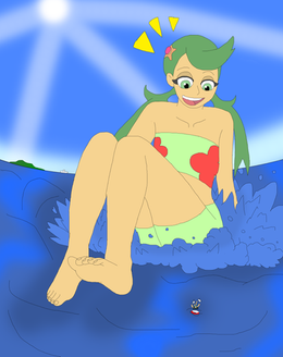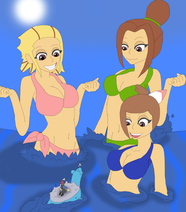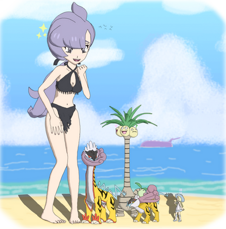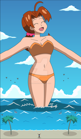 She requested for Lana, Lillie and Mallow from the Pokemon series as giantesses having fun out at sea with Lana and Mallow splashing each other (with a few Magikarps along for the ride), while Lillie holding a Lapras close as she's happy to be able to hold Pokemon. With Ash and the rest look on at the beach.