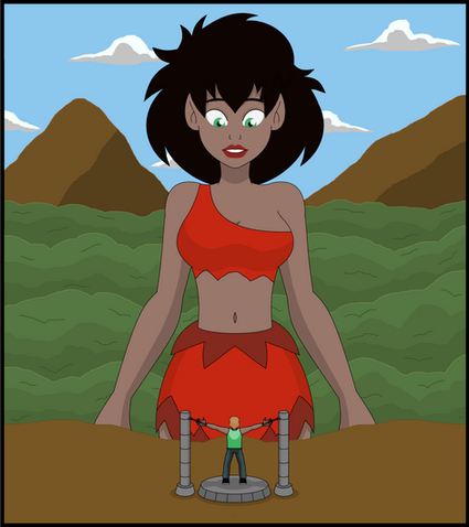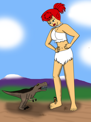 This is an art-trade withFor his half, he wanted Jane from Disney Tarzan dressed in the outfit she wore during theΒ dinosaur episode from the TV series as a giantess as she's about to fight against a T-Rex. Tarzan be by her feet.