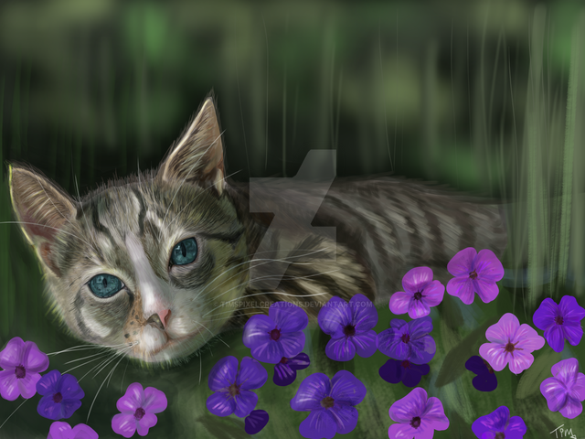 By the way, this is amazing! I love the way you did the rendering of fore, middle, and back-ground, how it gets less and less focused. Also, I admire the contrast with the white, yellow, and greens, they stand out but also blend nicely in the color palette.