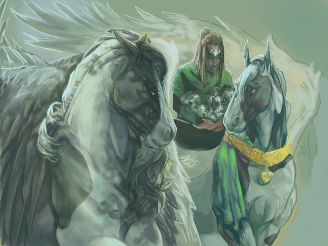 “Sorry, girl.” He murmured, returning to his work on her mane. After a couple of days out on the flat steppe, bossing Mahesh’s herd around, it had become a net of tangles and knots. He worked gently, brushing through each section of smoothed hair with his fingers, and feeling a covert satisfaction as the mare relaxed under his touch. She gazed out over the grassland lazily, pausing when she landed on Batis grazing with the rest of the herd. “I’ll be done soon and you can rejoin him.” Aybek said. Bansari whuffed - good - but he could tell she was content enough to stand and be groomed for a while longer. He smiled to himself.