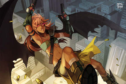On the left is her devil form -- she's a ranged fighter that emphasizes speed, so her armor is pretty shabby. Plus, she's thin as a stick. On the right is her human disguise that she uses to blend with the normal folks on Earth. She also happens to be a violent taxicab driver.