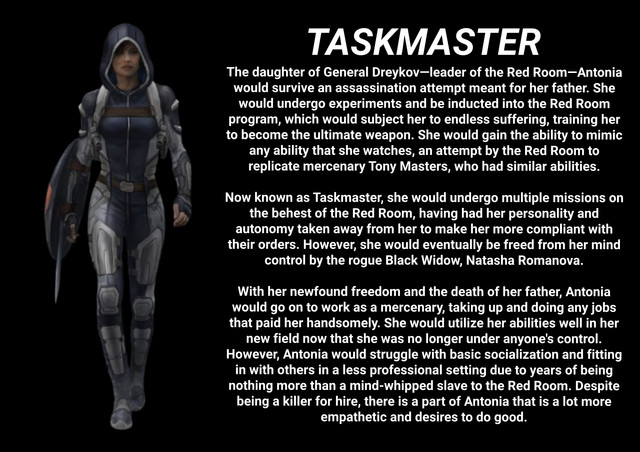 So far I saw he's mimic CAP, BW, BP & Hawkeye. On trailer 2, some say he's copy spiderman (swing n stuff). But i fix it later on.(if i'm wrong). But so far..Taskmaster will be new badass villain >