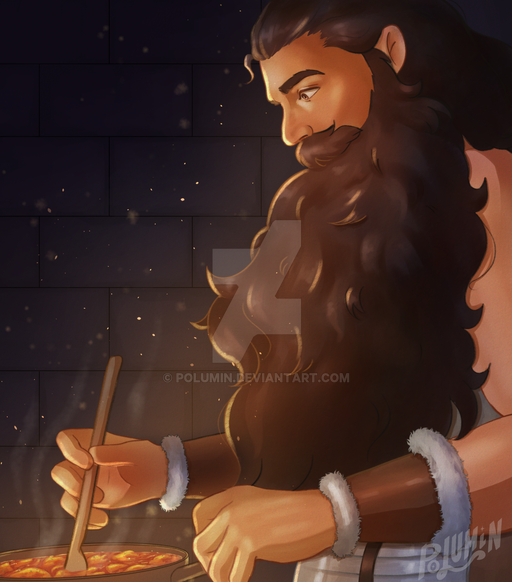 Kendrick was tending something in a pot over the fire. He held a wooden spoon and tasted the contents, sampling it. His head cocked a bit as if mulling over the flavor. He reached over and took a bowl filled with what looked like a spice and pinched a bit into the pot. A quick stir and a second taste yielded an approving hum from him. Satisfied, he set the spoon off to the side and then turned, bright amber eyes falling upon her. She instinctually shied down under his gaze, wings falling back.