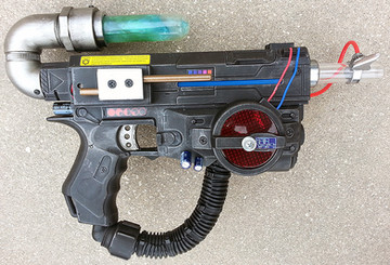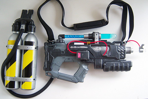 The base gun is a Nerf Rattler Super Soaker water gun. Β The front grip has been extended and screwed into place on a PVC pipe that runs into the gun body to give it stability.