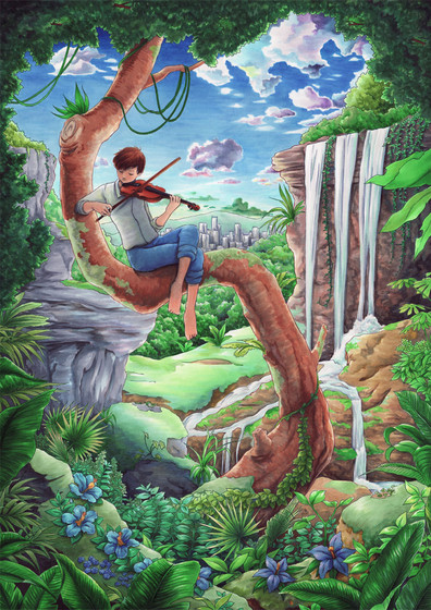 I started off drawing a rough sketch of the image on regular paper to get an idea of what I was thinking onto paper and see where I wanted the different elements to go. Once I'd decided I liked the rough sketch I then scanned the image and redrew it onto larger watercolour paper.