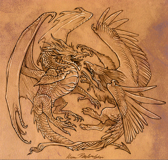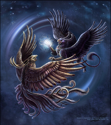 This is just beautifully done. From the choice of colors to the very dynamic pose between the two mythical birds.