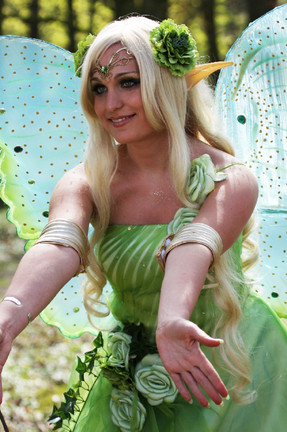 Fairy Lore & Design ConceptI designed this costume to wear to the Labyrinth of Jareth Masquerade Ball 2011. I wanted something that looked as though this Nymph pulled sheets of moss and greenery that grew on the banks of still water ponds to cloth herself. The beautiful burn out velvet already had the texture and colors I wanted. I added clusters of furn, yellow lilys, and purple hydrangea for a splash of color.