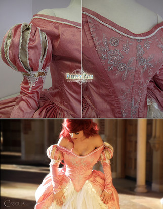 This is exactly what I wanted to look like when I was seven haha! The inspiration for this costume comes from all the girly dolls from the 80's I played with as a child. “Lady Lovely Locks” and my princess “Barbie” dolls. I placed gilded apliques of flowers and vines growing up the bodice. Butterflies were also used multiple times though out the design. They are attached through out the skirt, the center of the chest, and finally the classic butterfly wings.