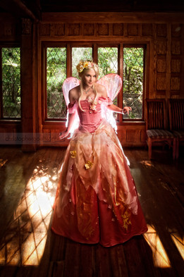 The Masquerade Fairies Collection is made up of four fairies, Brittany as the Blue Masquerade Fairy, Vani as the Indigo Masquerade Fairy, Adella as the Lavender Masquerade Fairy, and myself as the Pink Masquerade Fairy. Every girl deserves to be treated like a princess. I derive so much joy from turning my friends into these mythical characters for a day, dressing them in beautiful gowns and placing them in an environment to match. This is a dream project in collaboration with Photographer Indigo ([link] ). With the talent of Indigo, the beauty of these ladies, and help of my friends we have brought these fantasies to fruition!Each gown was designed to be something that encompasses my vision of what fairies would wear to a Masquerade Ball. When designing the four fairies I sketched out the things that first come to mind when you think of the classic fairy princess: butterfly-shaped wings, flowing gowns, and long, wind-swept hair. These are the creature you find in castle courtyards, hedge mazes, and royal gardens. Pruned and proper, elegant and refined, every gem, every flower, was thoughtfully placed to work in harmony creating the visage of a fairy princess in full regalia.