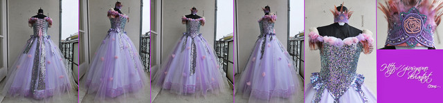 This fairy gown was inspired by the vibrant fuchsia 'Emma Louise' flower (www.rushcreekgrowers.com/indexβ¦ ). I wanted the overall look of the gown to resemble a upside down flower. The top being the sepal holding the petals that fall below. I made an asymmetrical underbust corset that laces up on each side under the arms. The silk ombre petals are decorated with varying size sequins and beads. It also lights up! I embedding LEDs in the wings to give it that "faerie glow" at night.Another version -Β