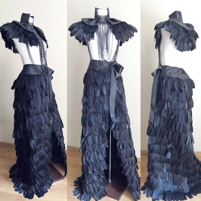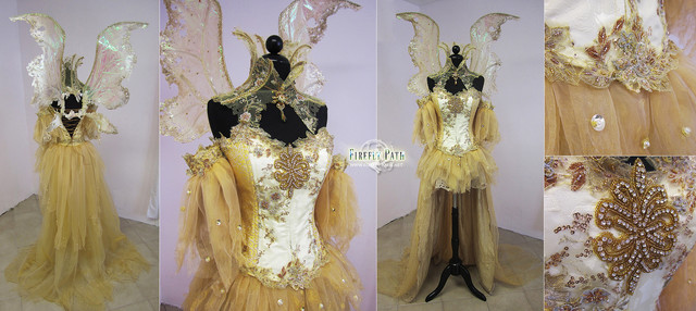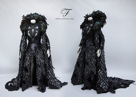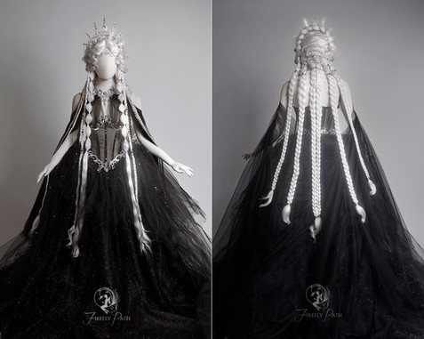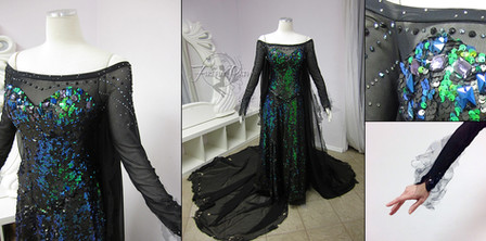 Follow Firefly Path costuming & make-up on Facebook - www.facebook.com/FireflyPathShadowy ribbons of sequin mesh wrap around her body and flurry from her sholders. Dark organza flowers are strewn throughout her gown.