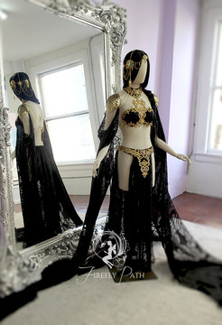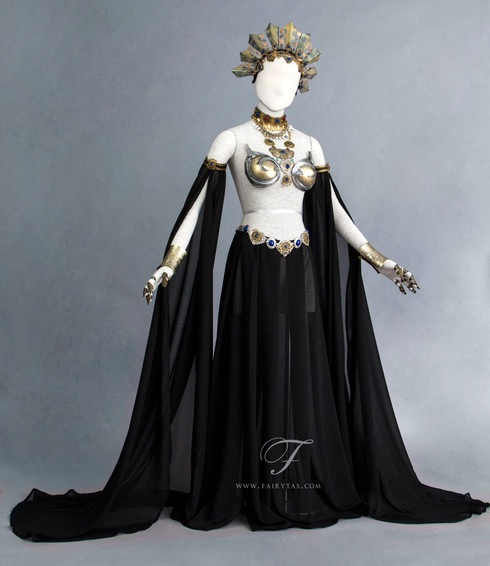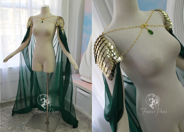 This is stunningly gorgeous with its contrast of light and dark, elegant and fierce, definitely an eye catcher. I would recommend the cape coming from the arms versus the collar. I love the detailing with the chain links from the collar to the scaled shoulder armor and it would probably have a higher range of mobility than if it was connected to the collar. Can't wait to see what's next in your projects of costumes and clothing.