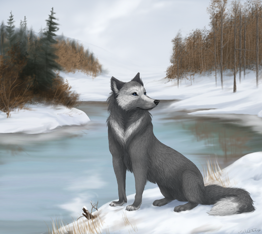 Holy God this came out INCREDIBLY! Man your digital art improves, like, every time you post something! It's positively inspiring! I freakin LOVE that stream! I love how pretty and turquoisey it is! It makes the whole piece kind of like a storybook or something! I like how you upped the contrast as well! It looks more like one of those low-light-angle days in the middle of winter. Allllll of those low-light-angle day >__>. Love the tree detail too! All that twisty pretty bark! And the birches! Birches are really hard for me to do for some reason! xD. I love the little winter birds too. Chickadees are, like, my favorite little birds, so I'm glad one got a cameo! The character looks AWESOME, too! Such a lovely dynamic pose with such amazing anatomy and such lovely DETAIL o__o. I love how striking that yellow eye is too. IT really stands out! Mmph I MUST commission you for something like this sometime! It's AMAZING! Awesome job! <3333