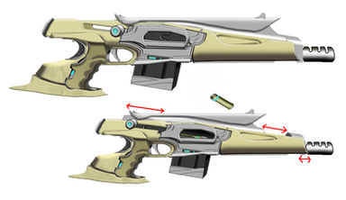 These nano-feedback relays can transmit information between the Revolution Rifle and Ken, and vice versa. This information could be absolutely anything; chamber temperature and remaining ammunition count, targeting and shooting solution information, etc. This nano-feedback relay also interacts with the symbiotic implants wrapped around Ken's musculature (as well as his other vital organs), and enables the rifle to actually control Ken's arms and legs. In concert with the rifle's automated guidance systems and external sensors (wind, velocity, barometric, etc), it ensures that Ken cannot miss a shot, almost regardless of the distance or velocity of the target. Like any sniper rifle, it is much better-suited for long-distance targets.