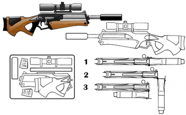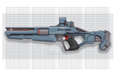 The original body of the rifle is as you see in the attached picture; sleek, simple, elegant, made of a blue-black-purple metal. It has no need for a trigger; the rifle fires purely by mental impulse (thus eliminating the muscle jitter created by pulling a trigger), and can thus ONLY be fired by Ken himself.