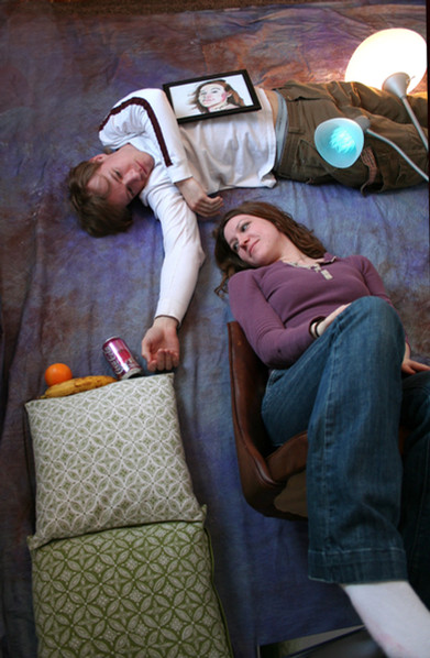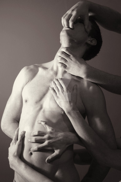 It at first seems to be a very sexual and play-full image. But the number of hands implies a struggle. The boys expression suggests he is resigned and bored, while the girl is laughing hysterically. I think there is too much going on out of shot to be really able to understand the scene. But that s what makes this so good.