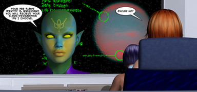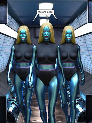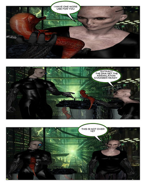 Teaser page for Chapter 19 of The Queen's Reign over at McComix (www.mccomix.com)Angela and Taylor are having a moment. They're trying to get out of the research station after it somehow has fallen to the Drones. But they have a problem- there's only one way left to get to where they need to go- and its blocked by a drone. One touch and its game over for whomever she grabs first. And it would seem Taylor is thinking about doing something Angela does *not* approve of. Love can make us do crazy things sometimes.