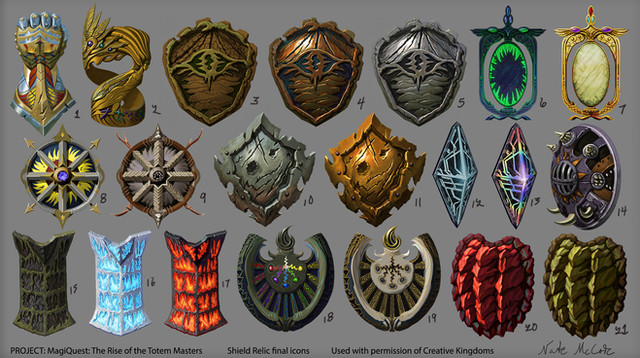 I like how the first and the second one would make great masks. Especially the second one; reminds me a lot of Majora's mask. Great job with the shields.