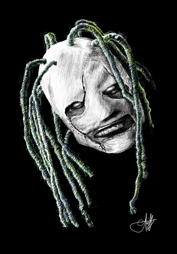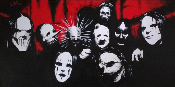 All 9 members of Slipknot, done in ink on Bristol board. There's really no coherence in the masks, as in they're not all from the same set of masks. Some are from the Slipknot S/T and some are from All Hope is Gone, and obviously some in the middle. I'm not really too proud of the numbers, but whatever..This took me about 3 weeks to finish.