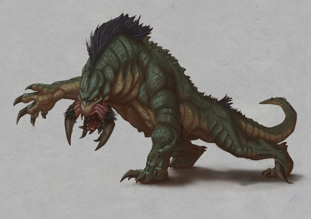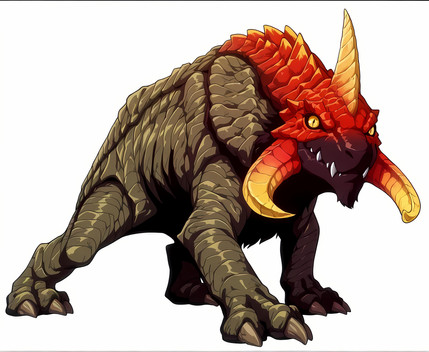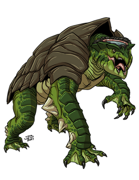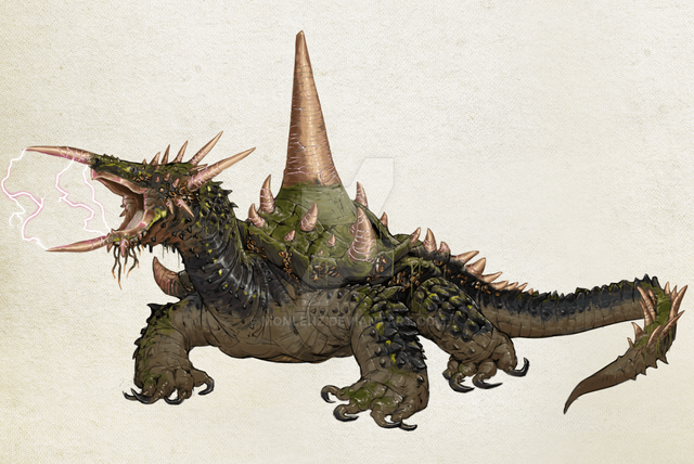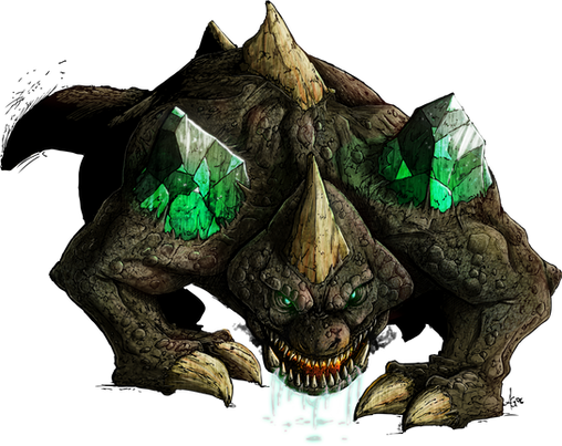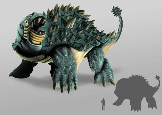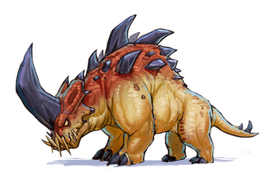 (Description courtesy of the concept artist, Rock127!)Basilicade grew from a little pest to a prime predator. Its bite can crush mountainsides, forming caves for its young to rest. Its entire head becomes sturdy as steel, and all that remains of its former head are its glowing white eyes, glaring from its metal exoskeleton. Its hull grows larger, enabling them to stampede through forests and knock down trees if wanted. If provoked, it bites, rams, then stomps its target, often injuring little monsters. Its large feet gave it dominance, and their stomps are made as mating calls, the louder the stomp, the more attractive it becomes.