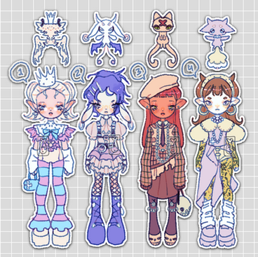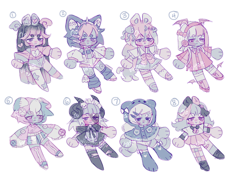 No bidding or anything, all of them are autobuy. if you're interested, click on the links under adopt status for the one you want and you can purchase them! You should automatically get the adopt file (transparent character + minipet png) without a watermark after payment! please comment if you claimed one so I can update the description! (Also I just like seeing who adopted my designs heehee)