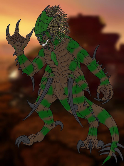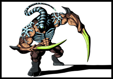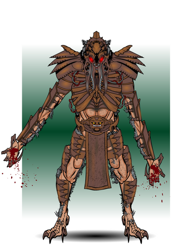Tasked with protecting the twisted domain it was created in, Shang Tsung's Flesh Pit Guardian is the bloodthirsty fusion of Shokan, Tarkatan, and Centaurian. Merged together by the sorcerer's magic, it exists only to inflict pain and suffering on anyone foolish enough to wander into the Flesh Pits without Shang Tsung's blessing.This is an old pic from at least two sketchpads ago that I've finally gotten around to finishing. Not much else to say about it. Freaky-ass fusion monster. Woo.