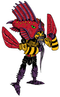 "Oh, how I enjoyed subjecting this one to the Transwarp mutation process⦠Injector is a former inmate of Kaon and a complete and utter egomaniac. The only thing that kept me from scrapping him outright was that wonderful aquatic alternate mode of his. With him under my thrall, I could sneak supplies past the Autobot barricade around Dinobot Island, and retrieve Allspark shards resting at the bottom of the lake, all without any risk of harm to myself. Unfortunately I had to turn to Swindle to provide the organic component of the equation; a venomous Earth Lionfish, somehow obtained out in deep space from a starship captain. The mixing of toxins in the fish, and his own Aquasting missiles made Injector near-impervious to chemical weapons, and the only known compound that can cause him harm is a selenium-based scalp rejuvenator. Despite all my hard work, Injector was less than thrilled with his new form and as soon as he was fully operational he fled into the lake, taking up refuge in a small grotto. How he manages to continue surviving down there is a mystery, but the sinking of a transport ship nearby leads me to believe he is subsisting on a particular beige Energon substitute."-Blackarachnia, DecepticonPredacon scientist