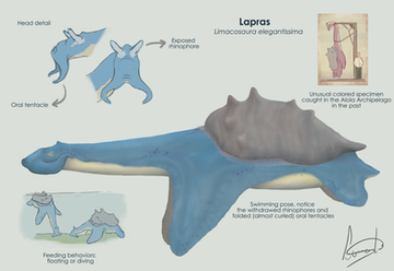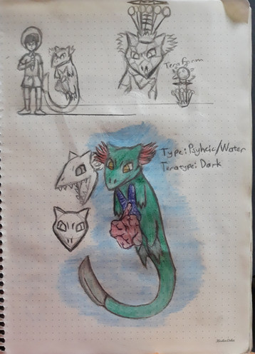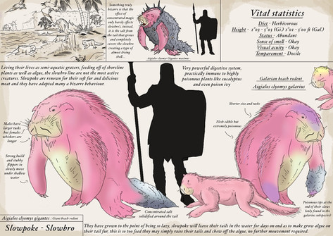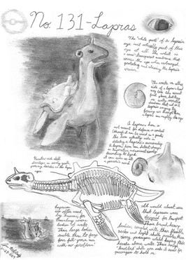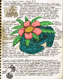 Jokingly dubbed 'Bulbasaur' by my colleague- the Seed Pokemon, Symboda aquiest, is a true symbol of symbiotic relationships. A bulb growing harmoniously with a reptile that harbors a different species of seed within. The bulb is partly empty space, with starch and nutrients to sustain the growth of two individual vines a plant, the seeds, and the reptile 'host.' The bright green pigmentation of the bulb and the reptile indicate traces of chlorophyll in both. The reptile seeks out sunlight that makes the bulb grow. Although this nomadic behavior is exhibited, Symboda aquiest regularly consumes grasses, berries, and leaves.