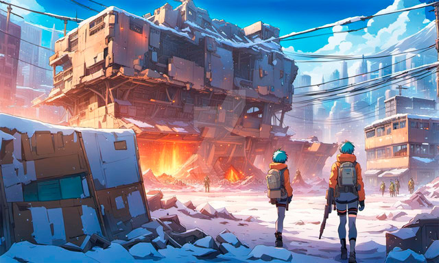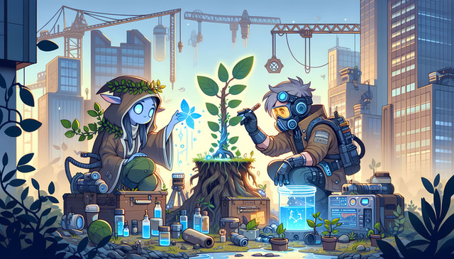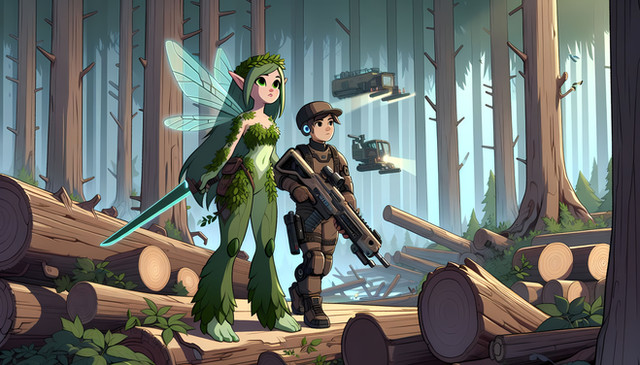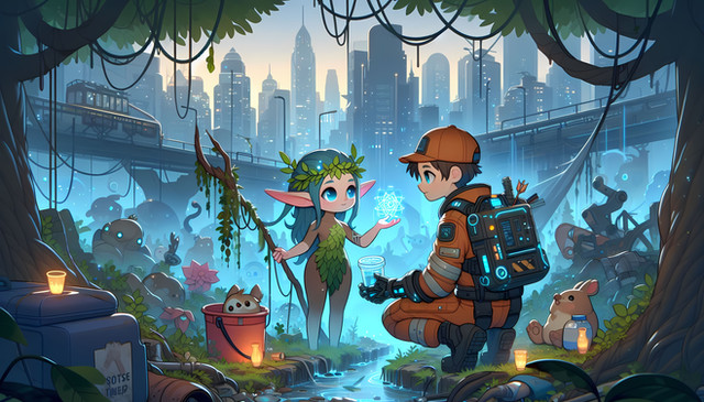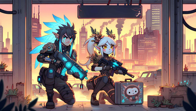 Short Story: The sun dipped below the skyline of towering buildings and digital billboards. The future city was alive with lights that mimicked stars in a galaxy far away. Amidst this dance of lights and shadows stood two figures - guardians from different worlds united by a common purpose.