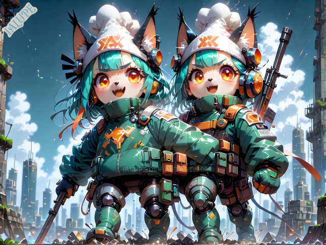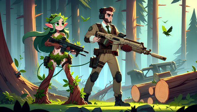 Caption: In a world where technology and nature intertwine, two guardians stand watch over the future city. Their eyes, sharp and vigilant, scan the horizon for any threats. The male guardian, armored in an advanced exoskeleton, is a warrior of steel and circuits. Beside him, the female guardian, with her mystical aura and attire adorned with symbols of ancient powers, represents the pulse of nature that still beats strong amidst metal giants.