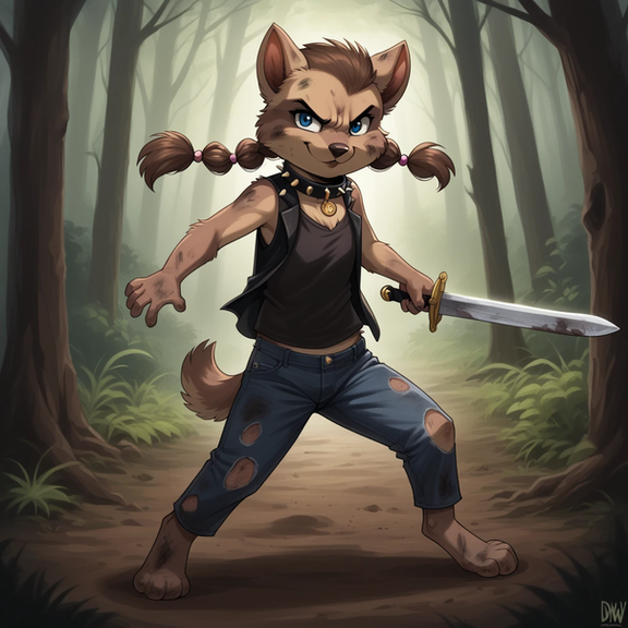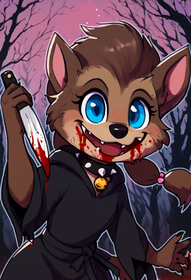 #furry #anthro #ai #barefoot #chains #collar #cub #dagger #female #girl #smile #weapon #werewolf #young #younger #cufs #hoteltransylvania #hotel_transylvania #winnie_werewolf #last_moment #ai_generated_art #imminent_dead