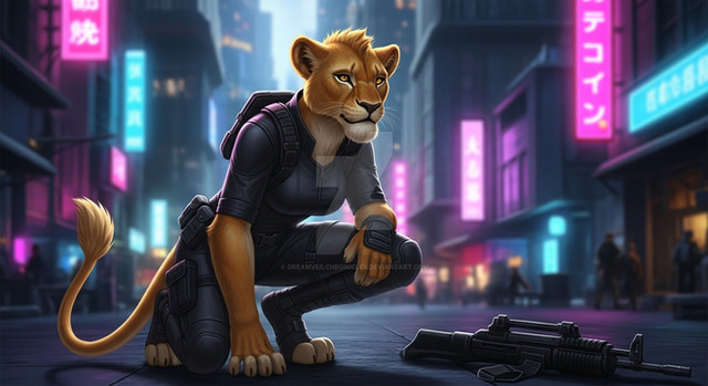 #feline #gun #ai #anthro #barefoot #city #cub #furry #lioness #ruins #shotgun #tlk #vitani #weapon #young #younger #the_lion_king #ai_generated