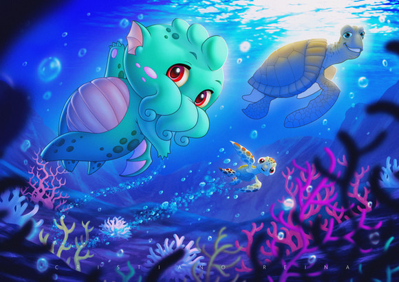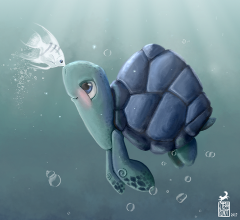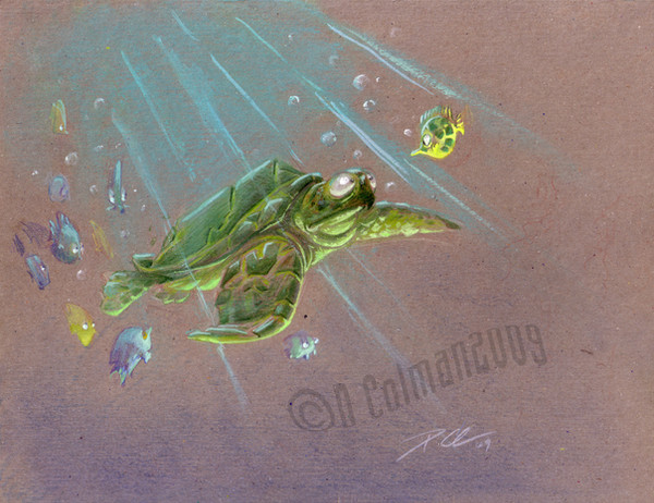 It's been a really long time since I've had a chance to draw anything just for fun. So, here is a silly little turtle that was in my head. Hopefully, it won't be so long in between posts for me in the future.Cartoon illustration of a happy little sea turtle swimming around with tropical fish.
