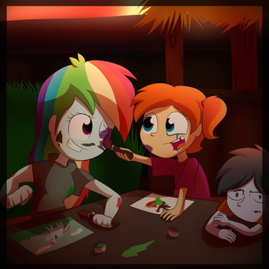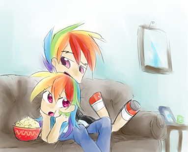 Spectrum Streak (Rainbow Blaze): "Calm down hun, Rd and I were just having a movie night. Anyways it's only a little mess, I'm sure we can fix it. If not, Rainbow, do you mind asking your friend Twilight to come over to help us out for a bit?"