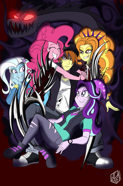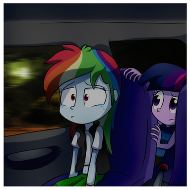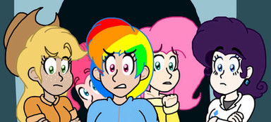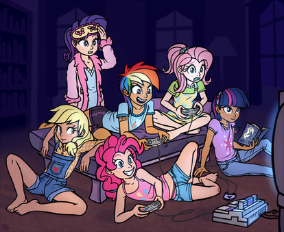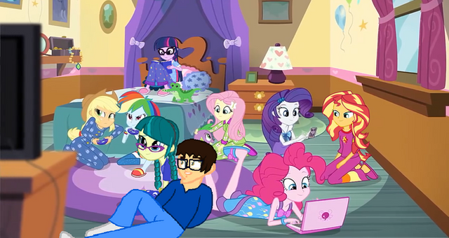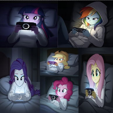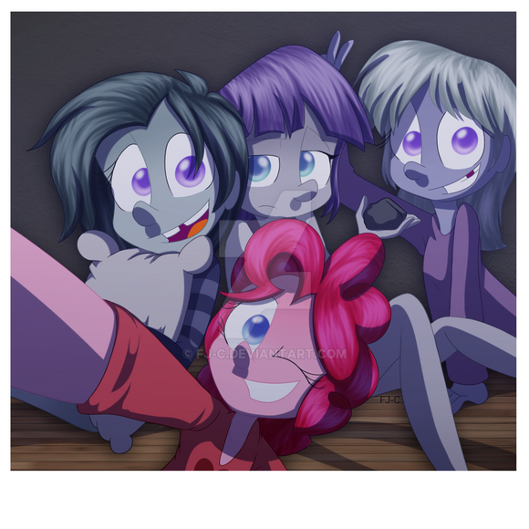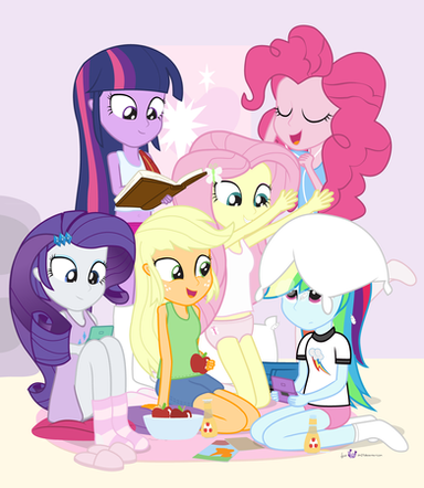 Rarity is textin', AJ is eating a pizza(while watchin'), Pinkie chewin' on a lolipop(also watchin'), and Fluttershy curled up in a ball just 'cause of the movie. Oh, and RD and Twilight are just watchin', definitely fits the mane 6. Β Β Β Β Β Β