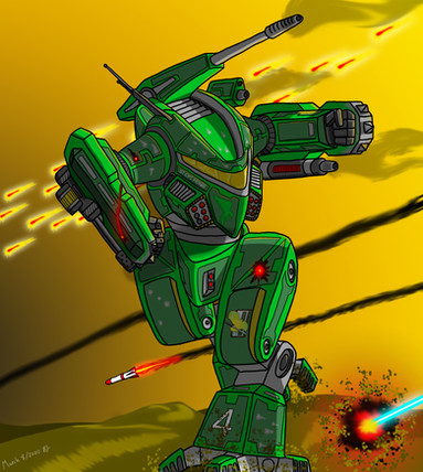 A Timberwolf, Dire Wolf, and Jenner IIC fire at unseen enemies.A mixture of 2D and 3D elements. Created using Lightwave and Gimp.