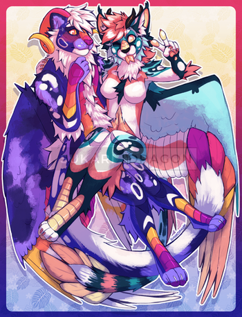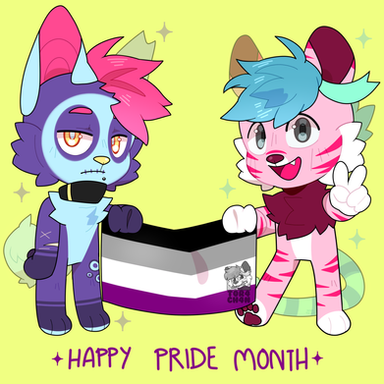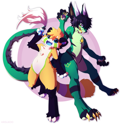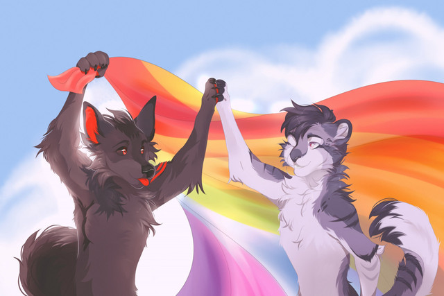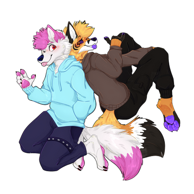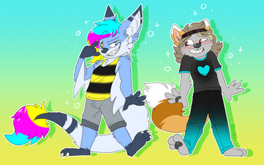 Commission for the Fursona Pins company of their mascot Sawyer and my fursona Flame!The flags on Sawyer's tails are all applicable to me, and include: