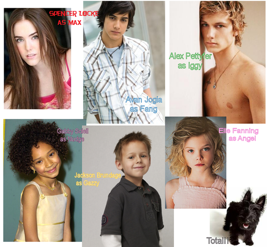 I agree with all of them except Max and Nudge... Max has blonde wavy hair, and Nudge, well her hair is straight. I know that people can just straighten, curl, and dye their hair, but even so... Gabby Scleil really doesn't look like Nudge(based on the manga version)... I would recommend someone else for Nudge and Max. Either then those two, they all look great! ...If only Jackson Brundage looked a little older than Elle Fanning... Because Gazzy is 2 more years older than Angel... btw Awesome choice for Angel!!! ...and Gazzy lol! If Alex Pettyfer's hair was combed down a bit, and got contacts, then we would have our Iggy!!! Great choice for Fang, too! ...but the best one you've got has got to be Total! Well done on him!!!!