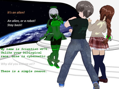 Could picture the girl sliding over the table and off the other side...so Scientist can't catch her...