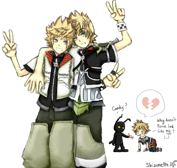 It's totally not funny, I know... =_=' It's actually kind of sad...This idea came to me while I was replaying the beginning of KH2, and Roxas freaks out just before he returns to Sora, saying that his heart is his own. I wondered what his reaction would be if he knew there was a person out there that looked exactly like him. Poor guy, not only is his heart not his own, but his looks aren't either. XD