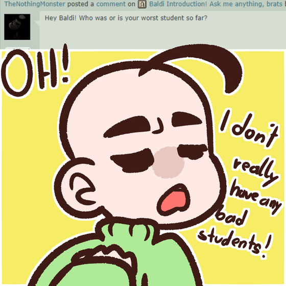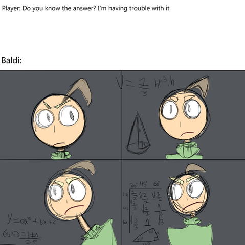 Baldi: I'LL GIVE YOU MATHS! *slams a big stack of math paper* GET THAT SHEET DONE IN ONE HOUR BEFORE I COME OVER AND OWN YOUR MISERABLE FAILED REAR! >:/