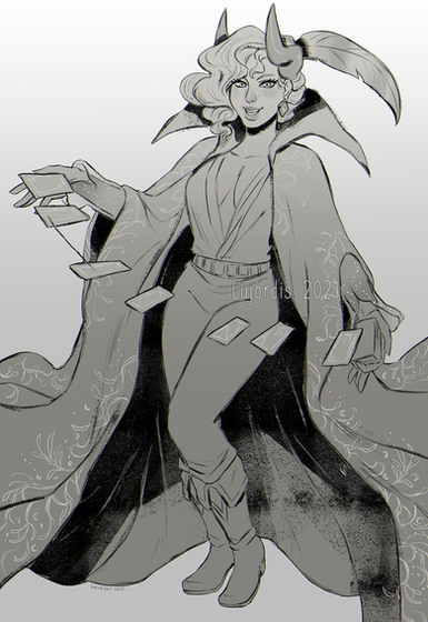 It's her Caerran character holding some tarot cards. My inspiration was the Astrologian class on Final Fantasy XIV