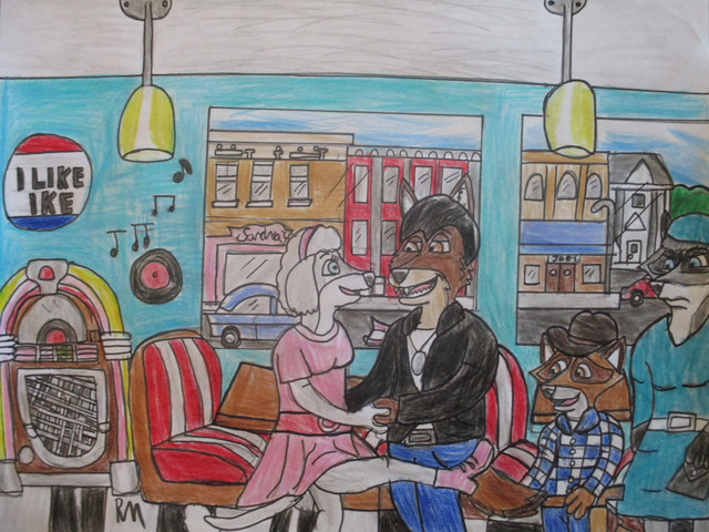 I love the wolf anthros, and the male wolf's hairstyle reminds me of Elvis Presley The car is interesting too! I also remember the phrase "Greased Lightning" from somewhere in 20th century history.