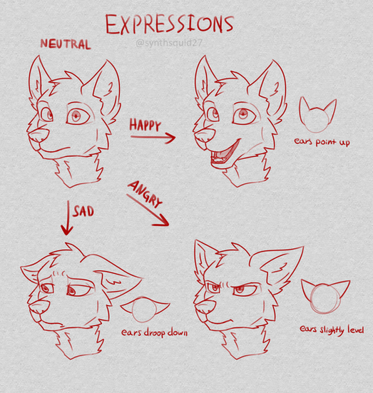 - EARS!! Y'know how I said necks make up for the lack of eyebrows 'a little'? Well the rest of it is in the ears and eyes. They can do wonders to show positive and negative emotions. For example, ears perking straight up should be used for excitement or surprise. Ears goign straight down should be used for deep sadness and fear. There's lots of variants for this like complete horizontal for grumpiness or one-up-one-down for curiosity. Go nuts.
